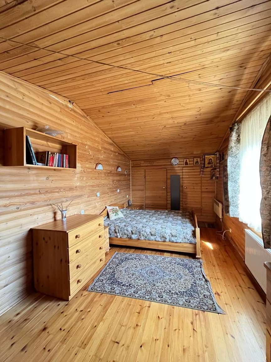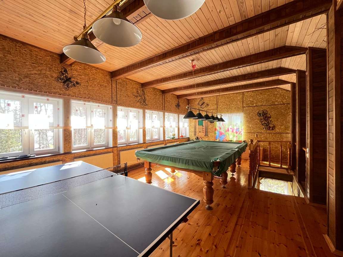 Другой двухэтажный дом на участке построен также на плите, пристройка на ленточном фундаменте. Строение каркасное также с отделкой ролл-хаус и крышей из металлочерепицы. Отваливается электрическими радиаторами, на первом этаже тёплый пол. На первом этаже находятся кухня-столовая с тандыром, санузел, на втором: бильярд и настольный теннис. Есть помещение под кладовую. В пристройке генератор.