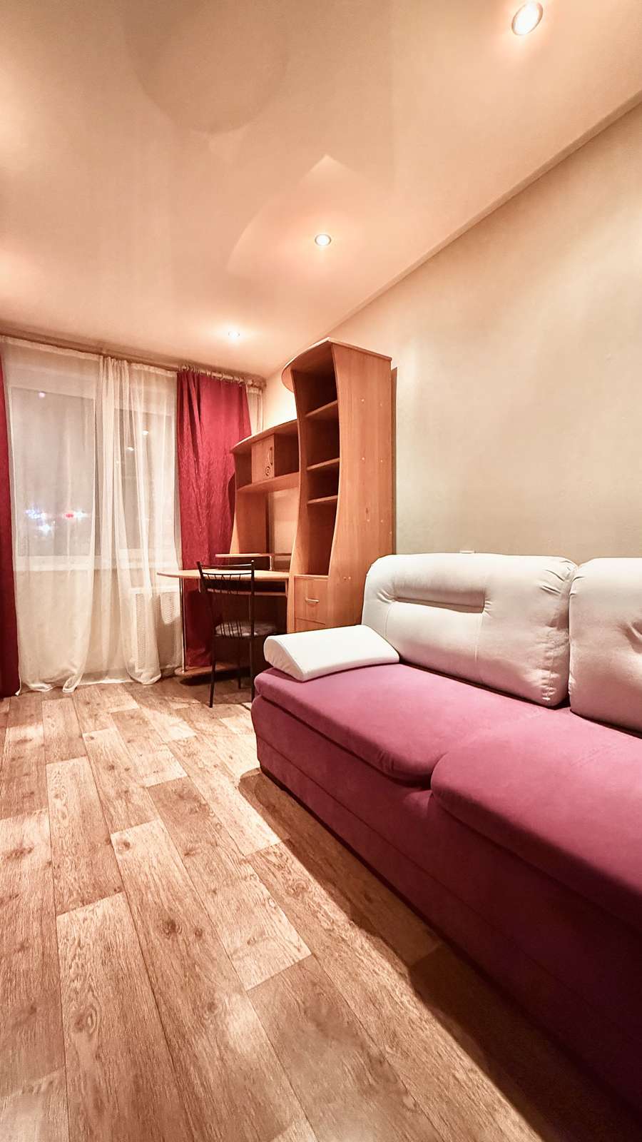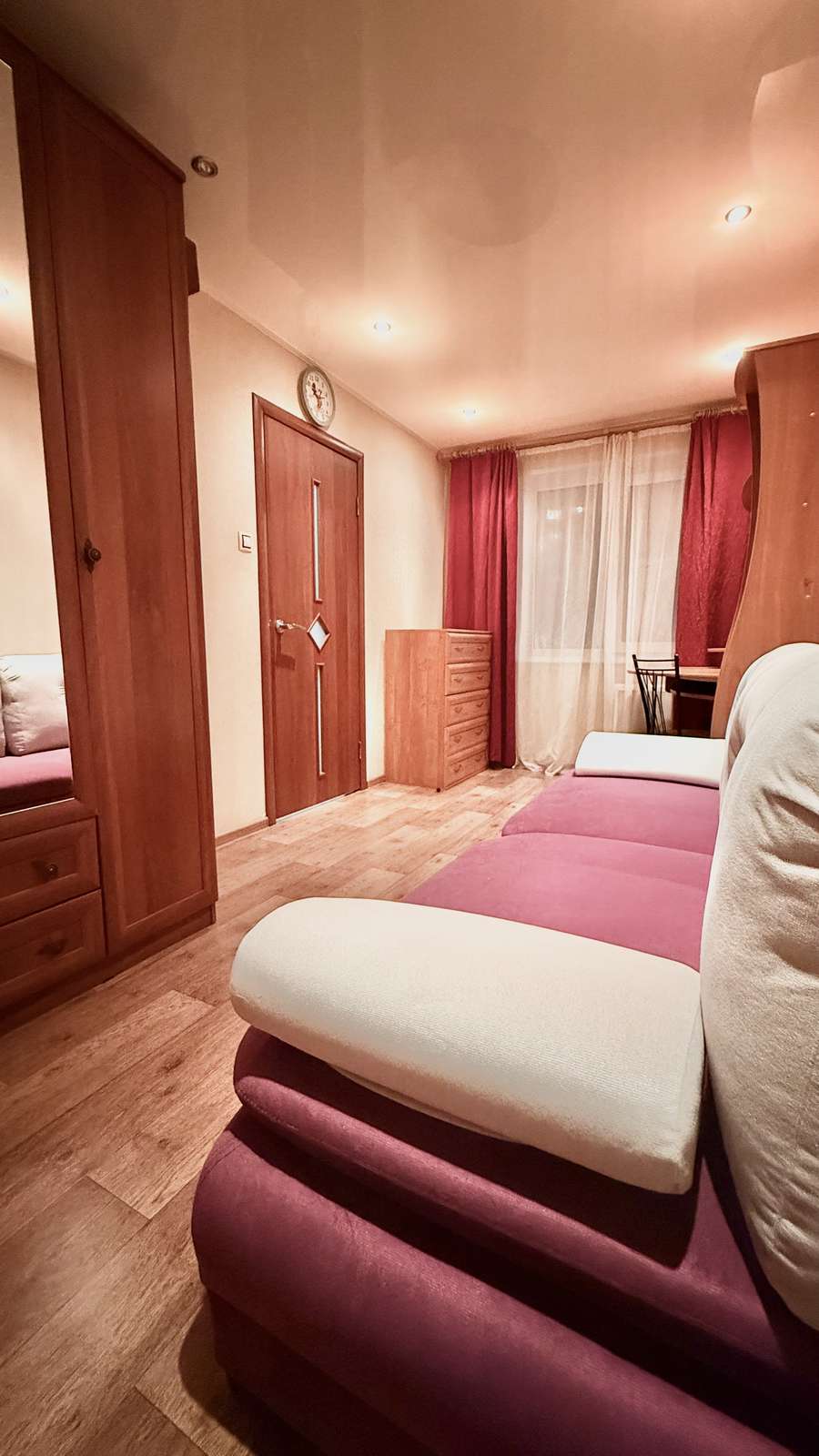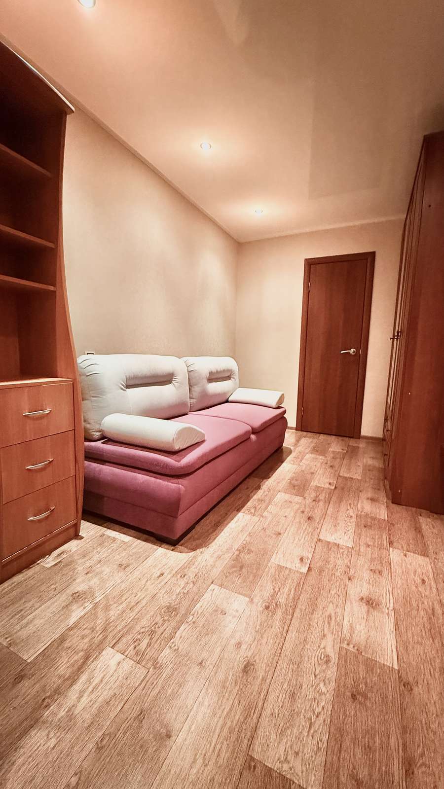 В спальне - угловой компьютерный стол, шкафная группа, гардеробная, также новый ортопедический диван фирмы Орматек, комод.