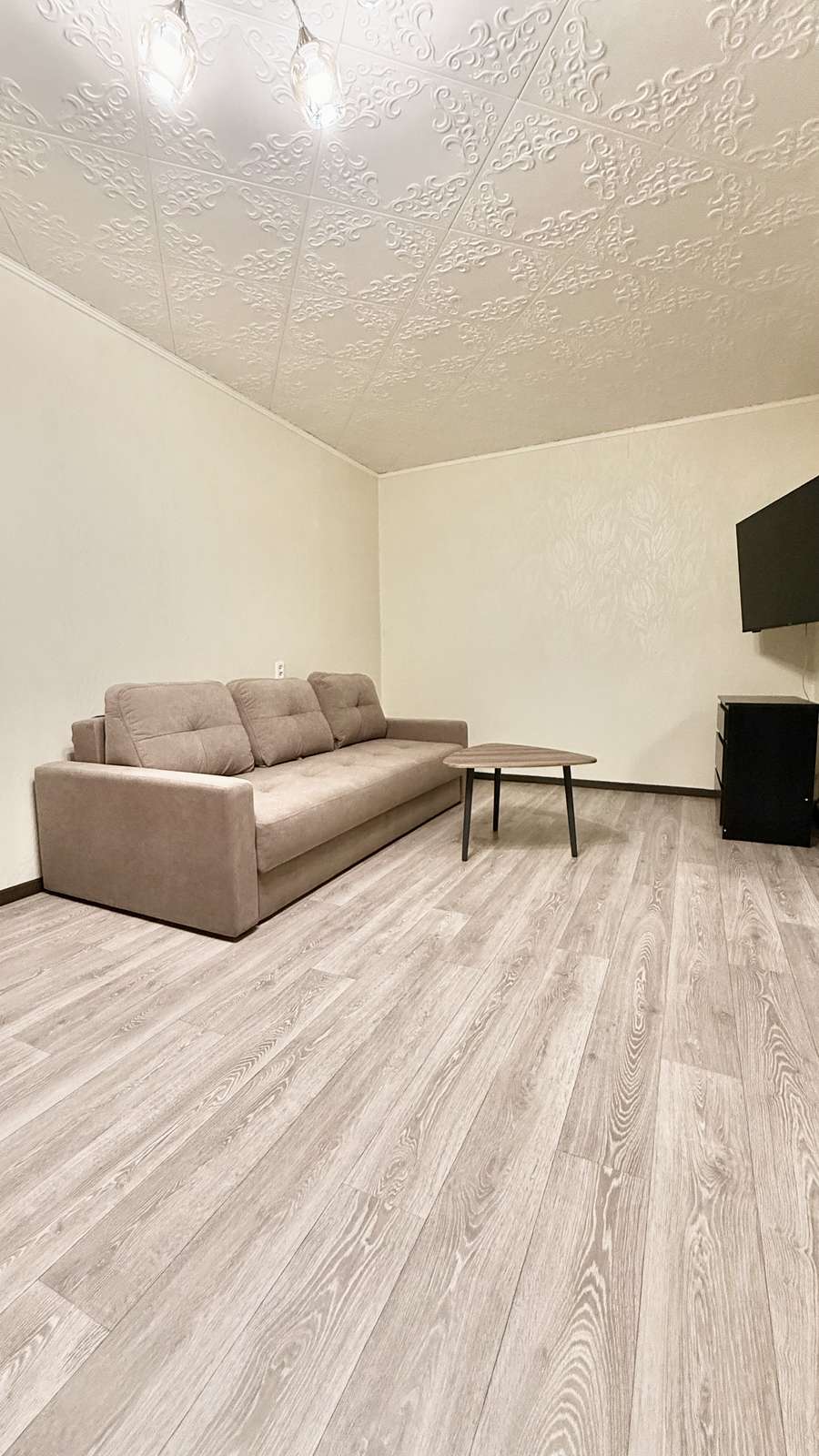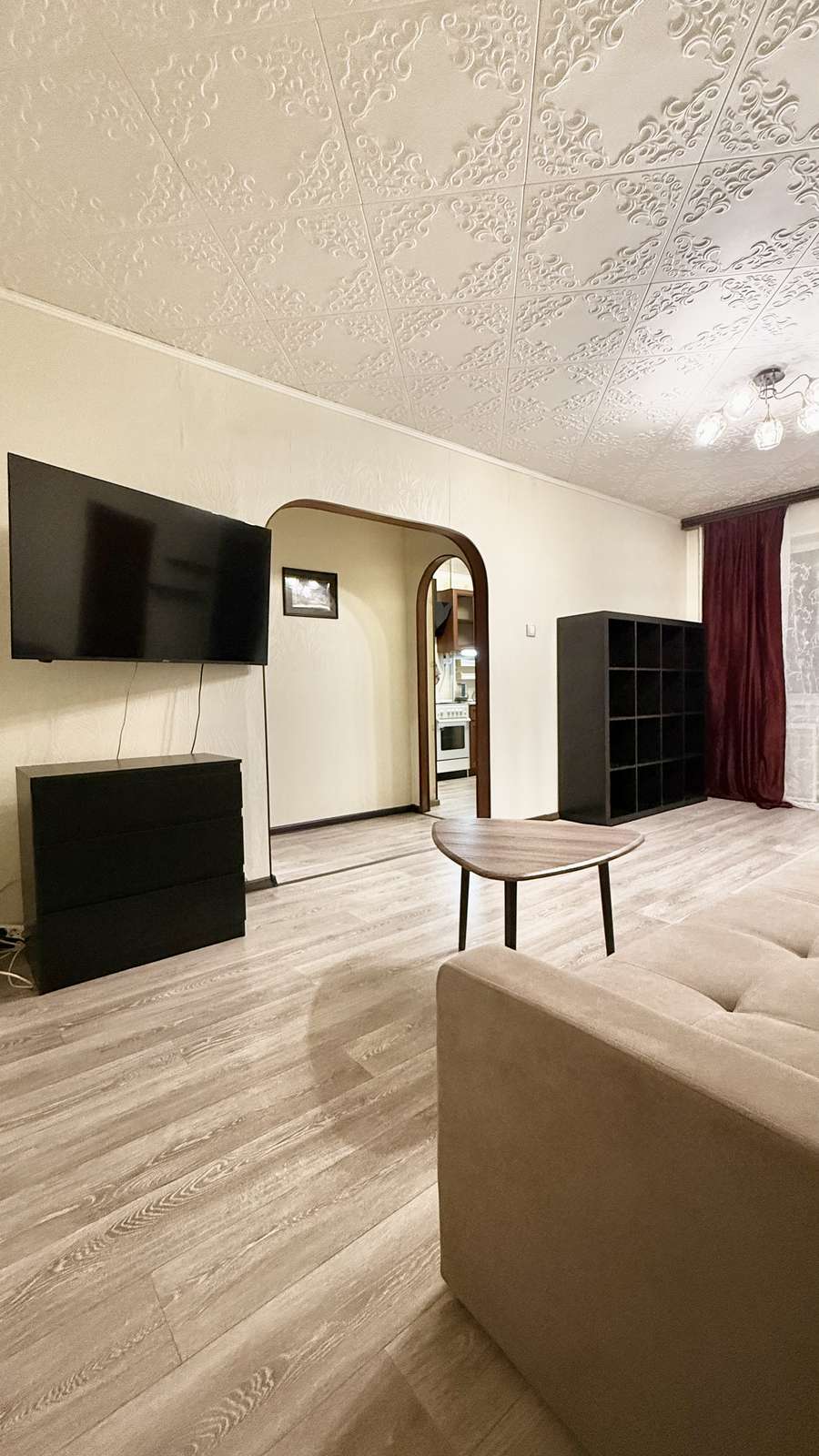 В зале - новый ортопедический диван фирмы Орматек, плазменный телевизор, комод, стеллаж.