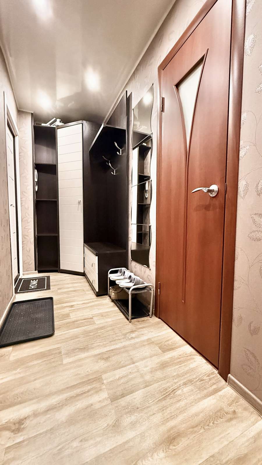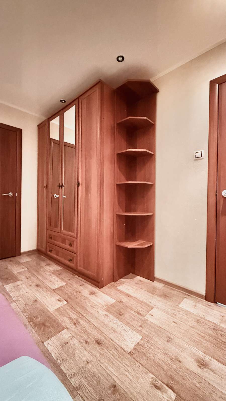 В прихожей встроенная мебель с большим угловым шкафом.