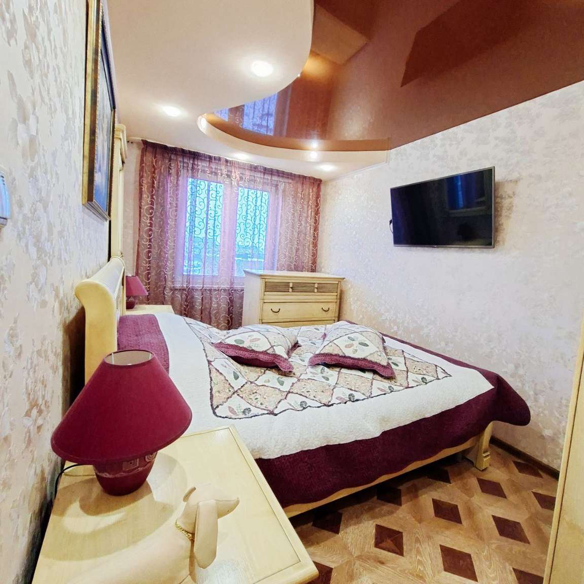 В коридоре и спальне натяжные потолки со встроенным освещением.