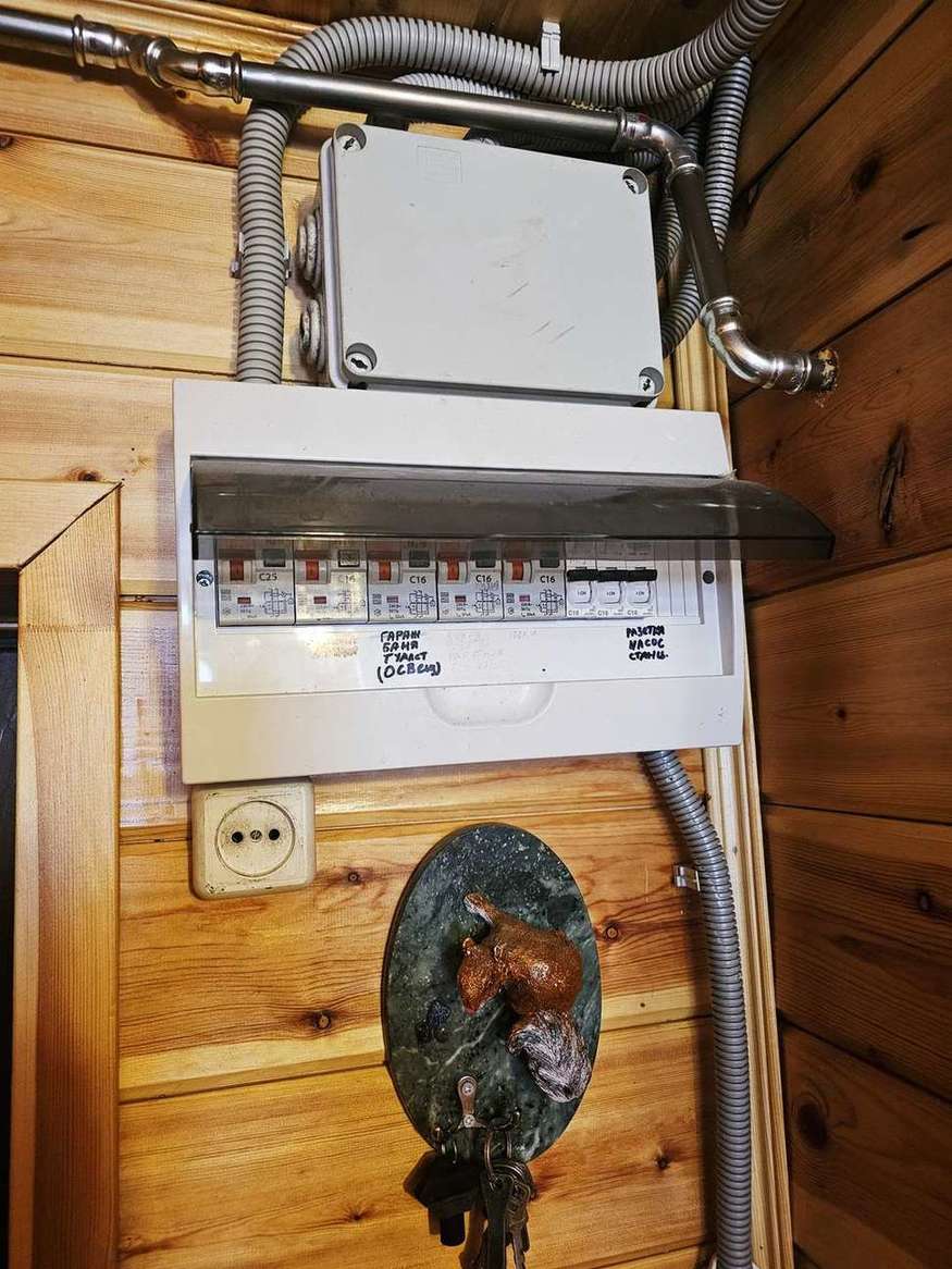 -Электропроводка проведена по всему дому, электропакеты; Установлен пакетник для переключения на автономное электропитание от генератора.