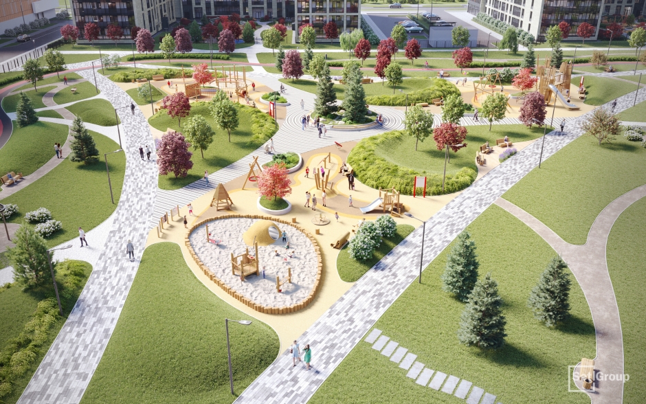 Доступ в жилой комплекс будет осуществляться через пять единых входных групп с авторским дизайном и лаундж-зонами. У каждого дома появятся закрытые благоустроенные дворы-патио. Единая концепция благоустройства предусматривает наличие огромного парка во дворе, разнообразных пейзажных зон, арт-композиций, беседок детских и спортивных площадок.