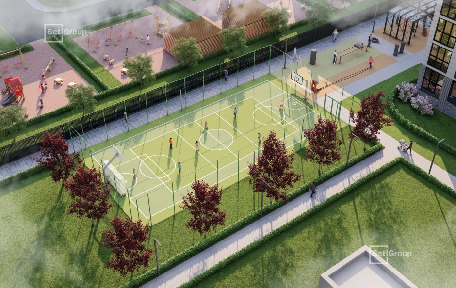 Благодаря концепции SetlPark пространства украсят хвойные и лиственные деревья, цветущие кустарники, каменные композиции и свободные газоны без посадок. На площадке SetlKids организуют игровые зоны для детей с крупными игровыми комплексами и горками-трубами, тоннелями и батутами, качелями, лазательным кубом необычной формы, бизи-бордами, лабиринтами, песочницами. На площадке SetlSport взрослые жители смогут заниматься на тренажерах, играть в футбол, волейбол, баскетбол и настольный теннис.