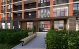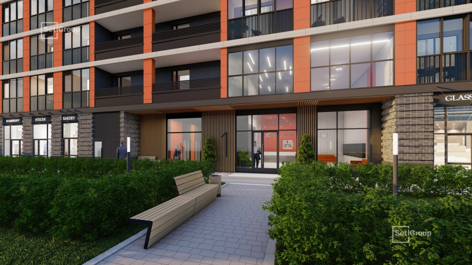 Оформление парадного холла повторит стилистку фасадов. Сочетание плитки светлых тонов с контрастными вставками создаст лаконичный стильный дизайн. В просторном холле площадью около 100 кв. метров и высотой потолков до 7 метров предусмотрены ресепшен и зона ожидания с мягкой мебелью и авторским освещением.