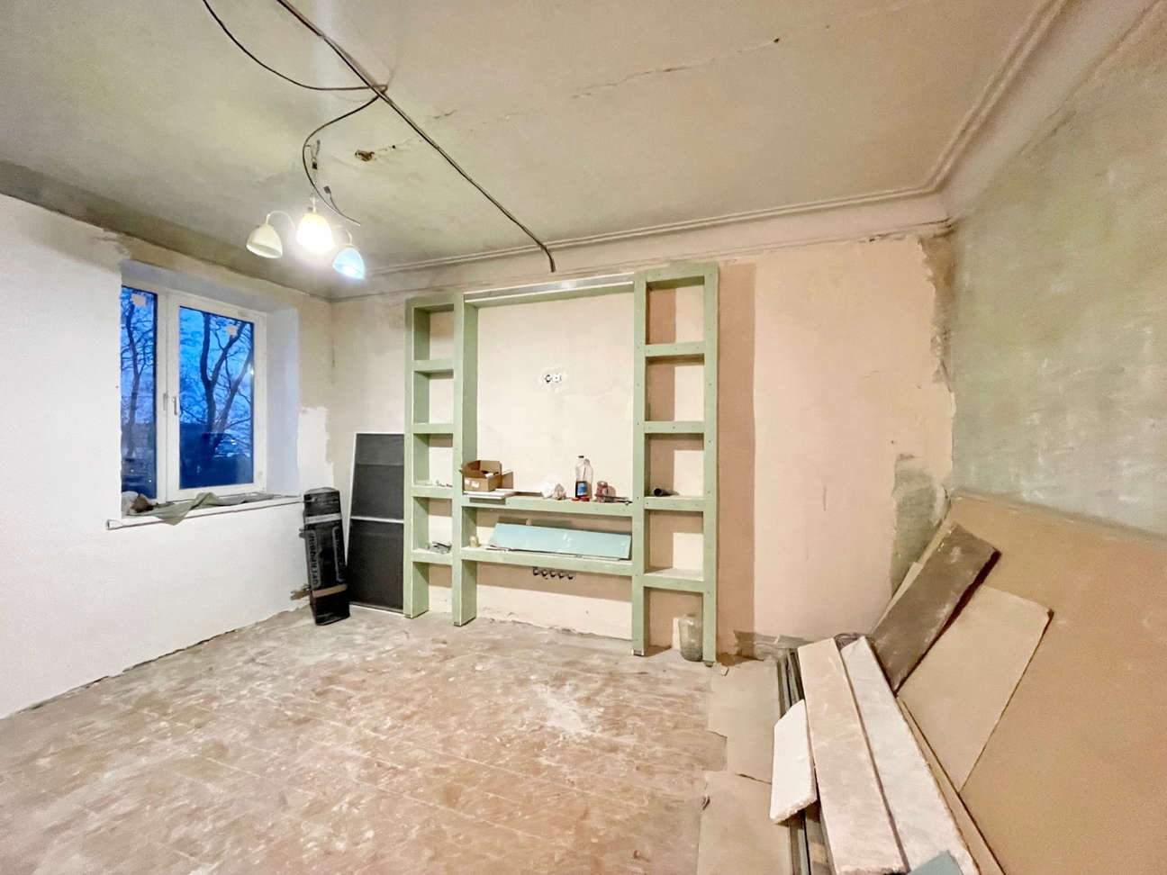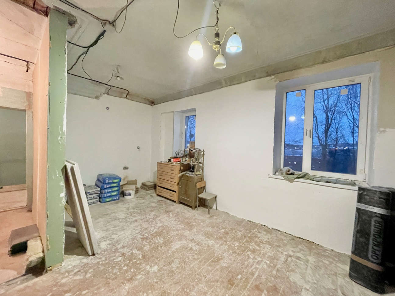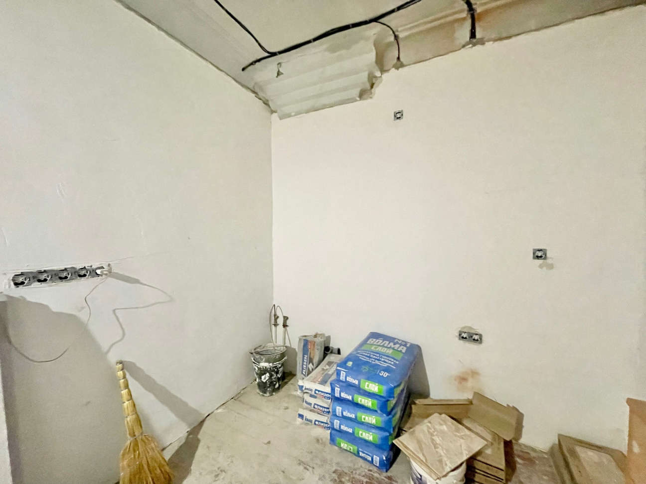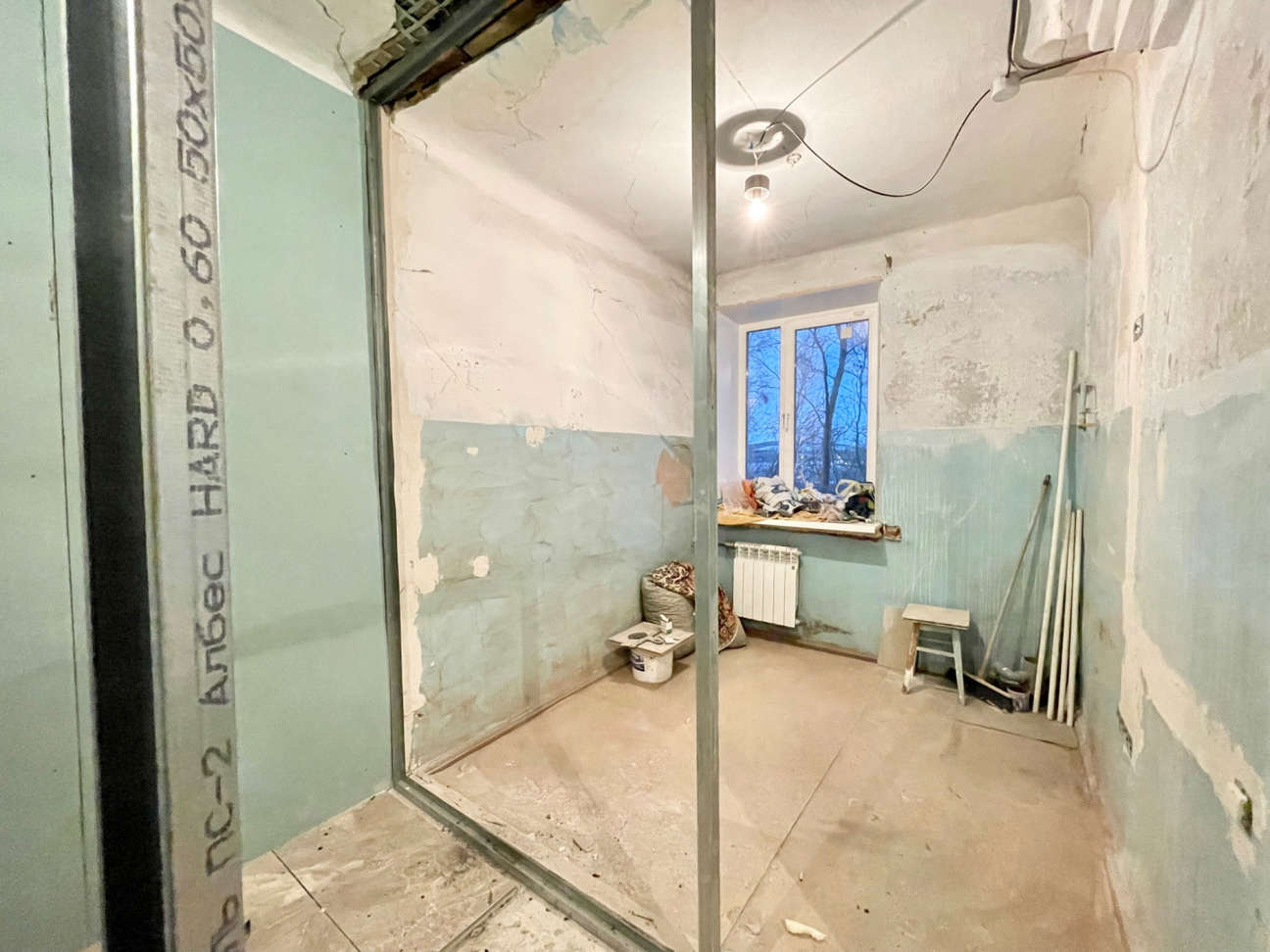 В комнате изготовлен короб под ТВ с выводом электрики и антенны. В санузле новые счётчики на горячую и холодную воду. Материалы для окончания ремонта приобретены и останутся покупателю.