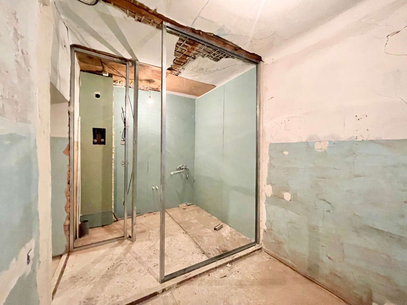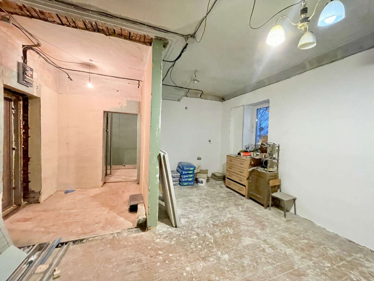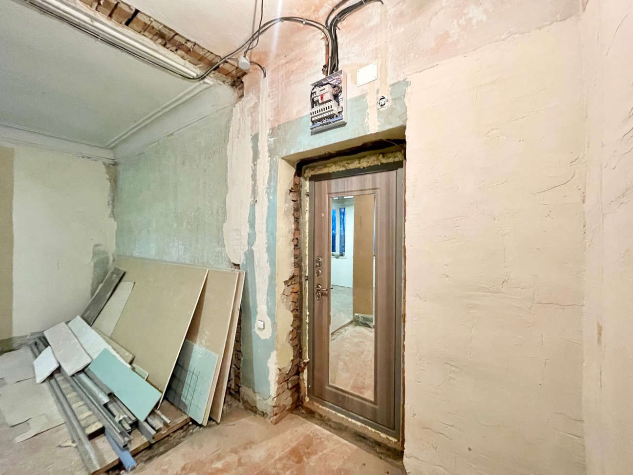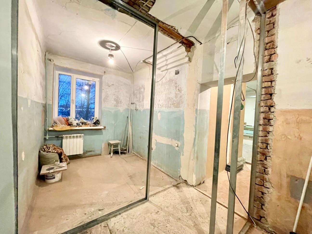 В комнате изготовлен короб под ТВ с выводом электрики и антенны. В санузле новые счётчики на горячую и холодную воду. Материалы для окончания ремонта приобретены и останутся покупателю.