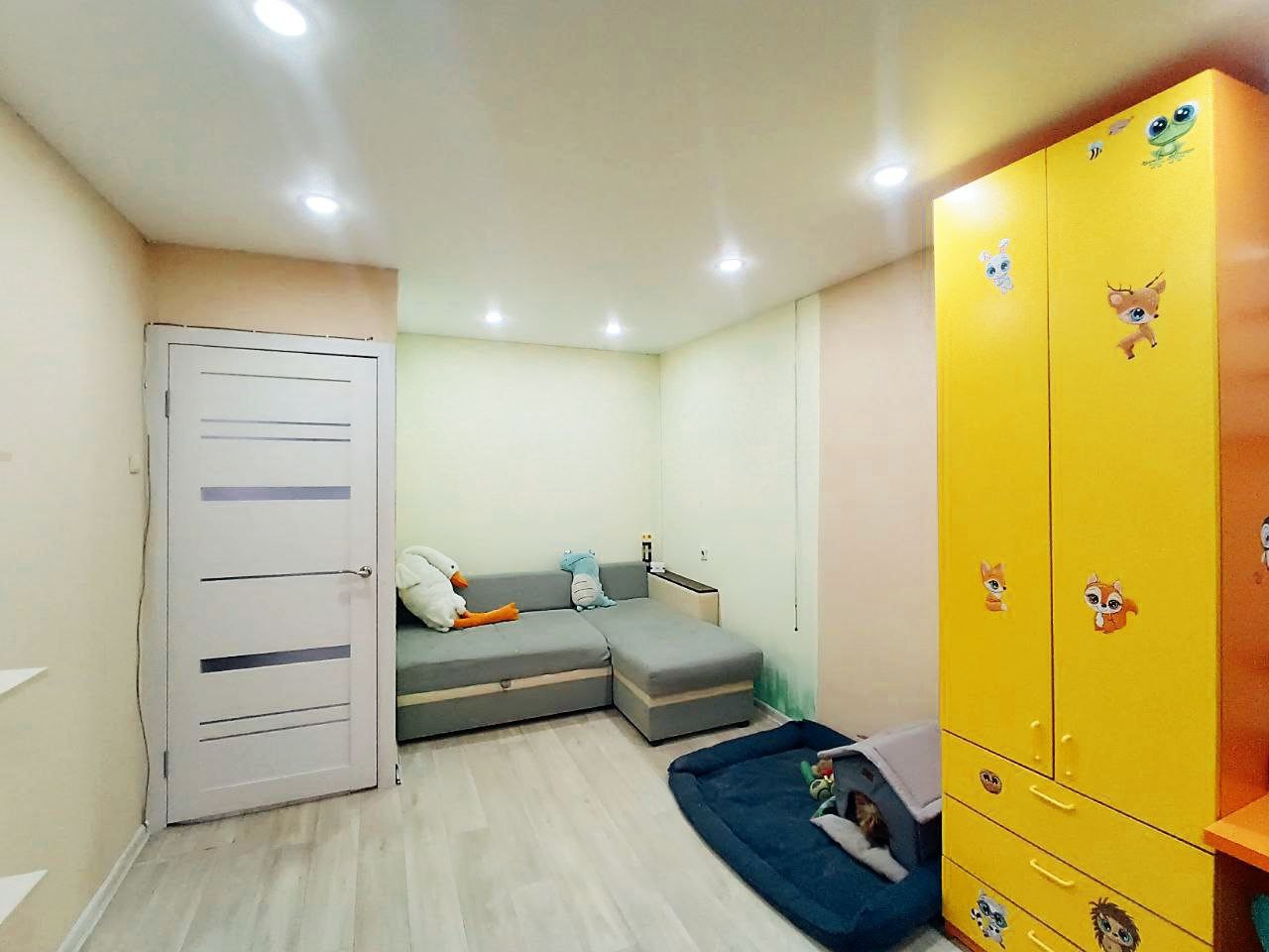 Сделан свежий косметический ремонт-обои под покраску в нежных тонах, натяжной потолок визуально расширяет пространство.