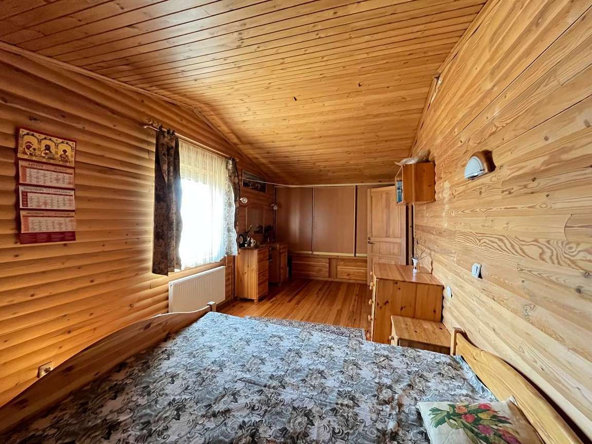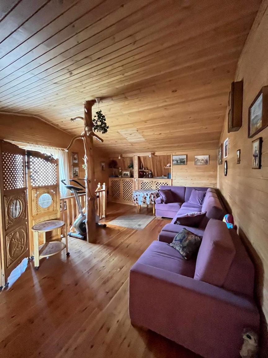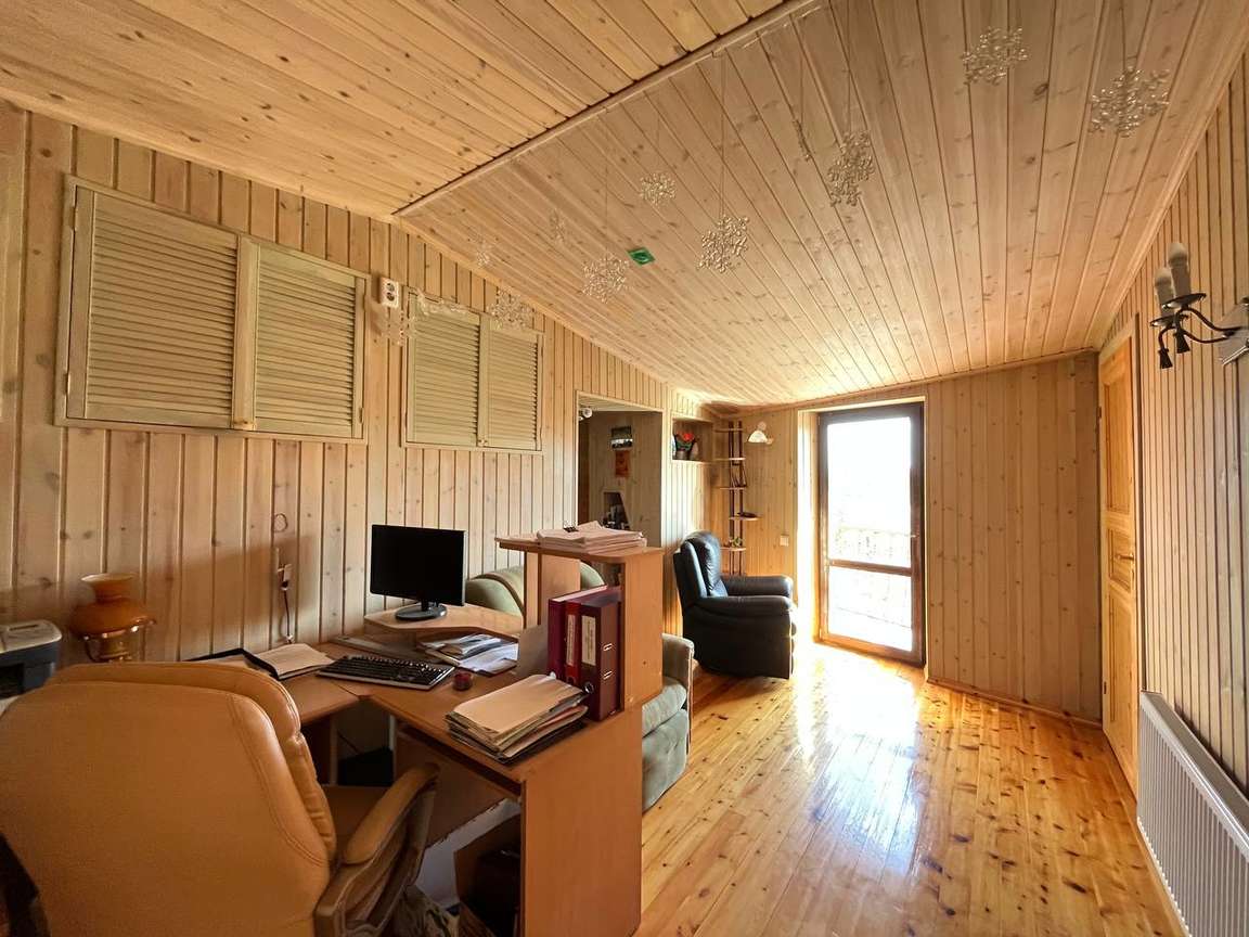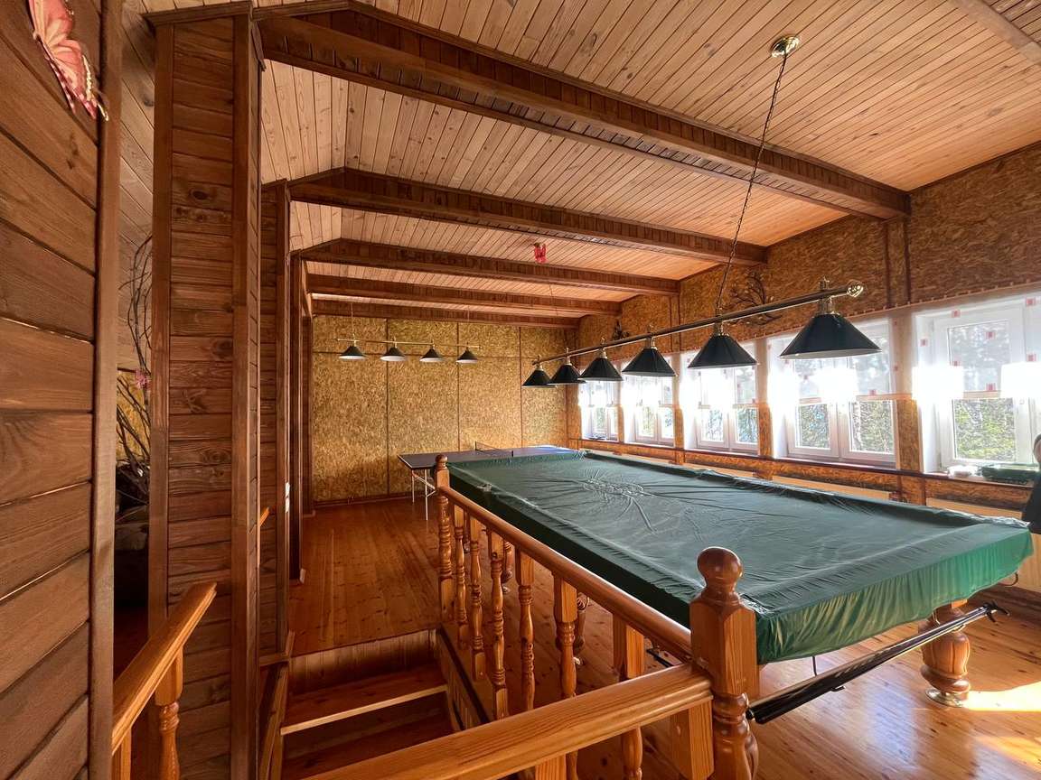 Другой двухэтажный дом на участке построен также на плите, пристройка на ленточном фундаменте. Строение каркасное также с отделкой ролл-хаус и крышей из металлочерепицы. Отваливается электрическими радиаторами, на первом этаже тёплый пол. На первом этаже находятся кухня-столовая с тандыром, санузел, на втором: бильярд и настольный теннис. Есть помещение под кладовую. В пристройке генератор.