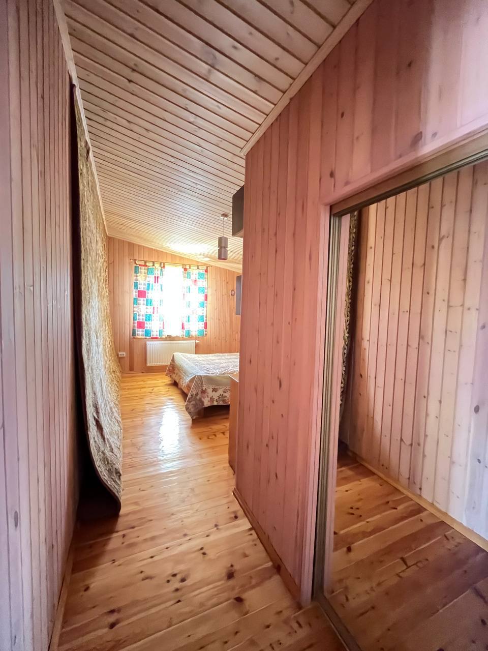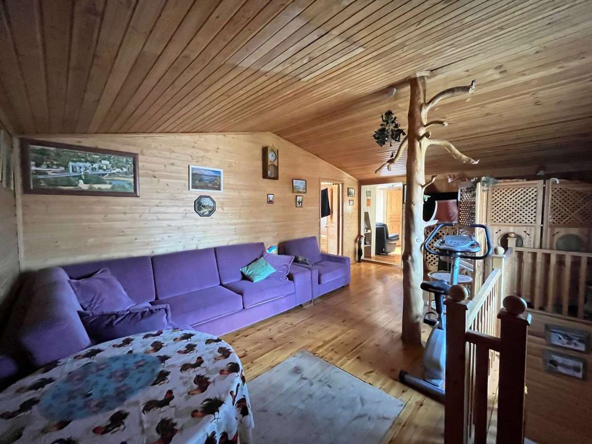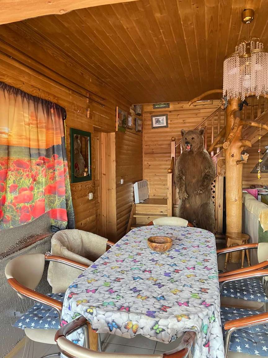 Другой двухэтажный дом на участке построен также на плите, пристройка на ленточном фундаменте. Строение каркасное также с отделкой ролл-хаус и крышей из металлочерепицы. Отваливается электрическими радиаторами, на первом этаже тёплый пол. На первом этаже находятся кухня-столовая с тандыром, санузел, на втором: бильярд и настольный теннис. Есть помещение под кладовую. В пристройке генератор.