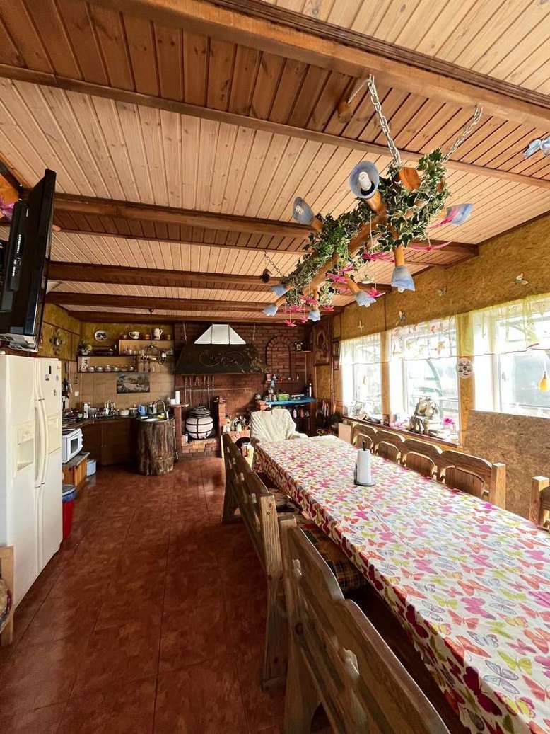 На участке оборудована мангальная зона под крышей с печью, дровницей, столом и лавками.