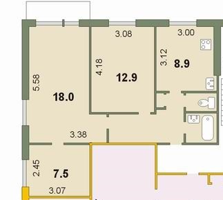 Общая площадь квартиры 58,8 кв.м. Кухня 8,9 кв.м. просторная и очень светлая.