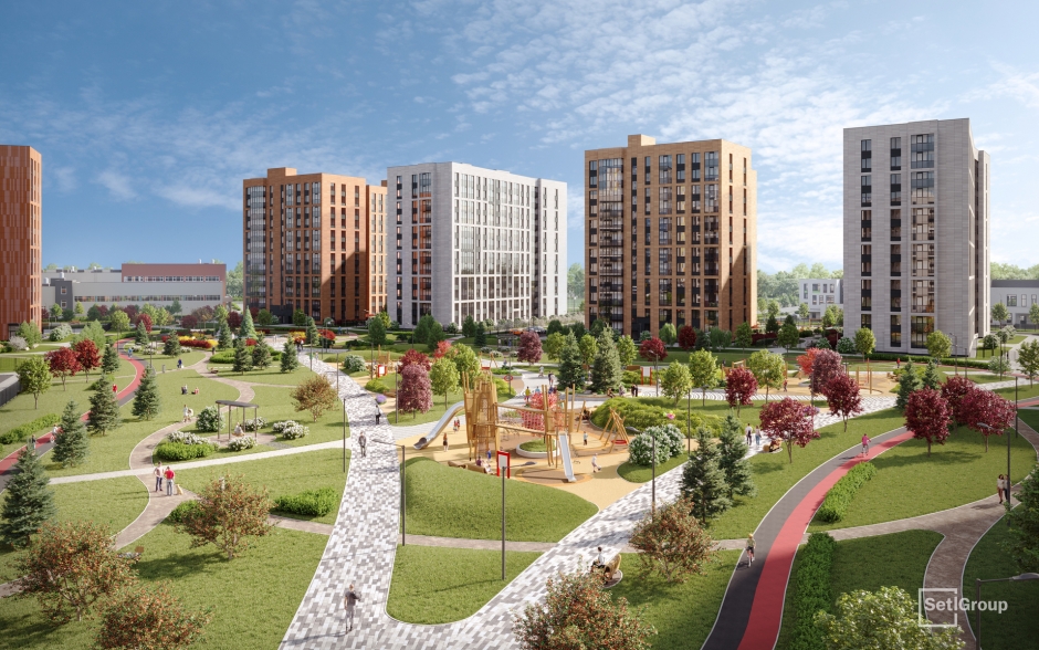 Часть территории жилого комплекса займет спортивный кластер: площадка Setl Sport, скейт-парк, зона настольного тенниса и тейкбола, большое игровое поле для командных игр.