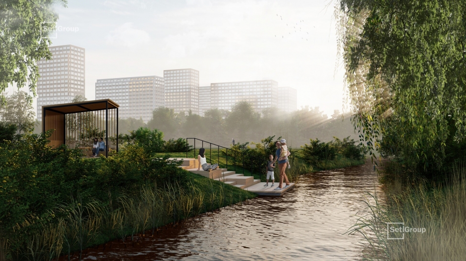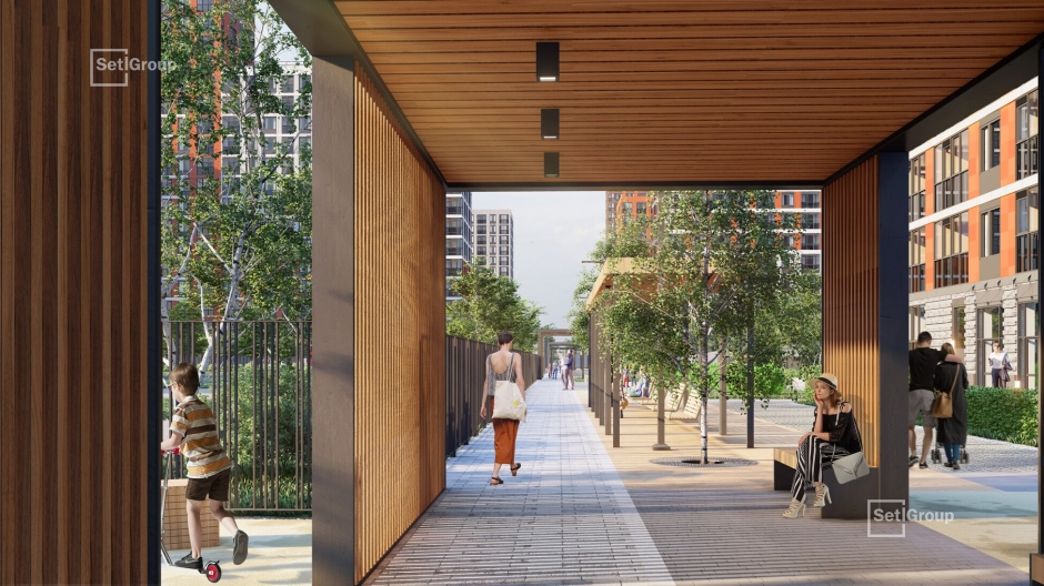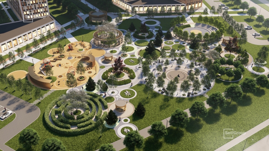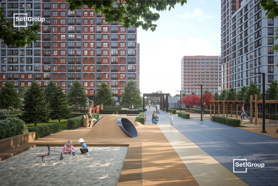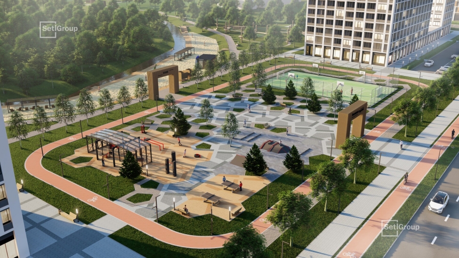 Благодаря концепции SetlPark пространства украсят хвойные и лиственные деревья, цветущие кустарники, каменные композиции и свободные газоны без посадок. На площадке SetlKids организуют игровые зоны для детей с крупными игровыми комплексами и горками-трубами, тоннелями и батутами, качелями, лазательным кубом необычной формы, бизи-бордами, лабиринтами, песочницами. На площадке SetlSport взрослые жители смогут заниматься на тренажерах, играть в футбол, волейбол, баскетбол и настольный теннис.
